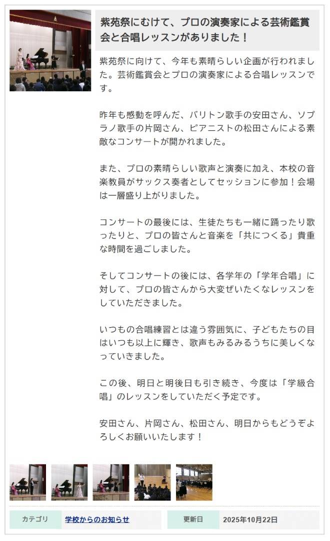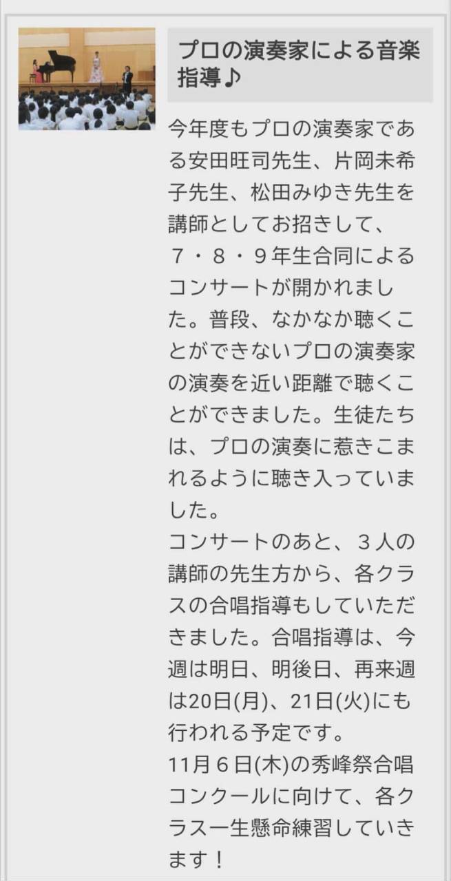 - コンサートのあと、そのまま各クラスの合唱練習を見てもらい、秀峰祭の合唱コンクールに向けた準備が一気に加速したこと。