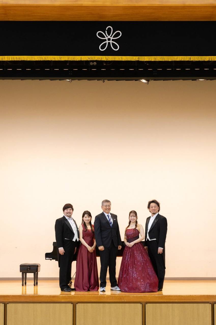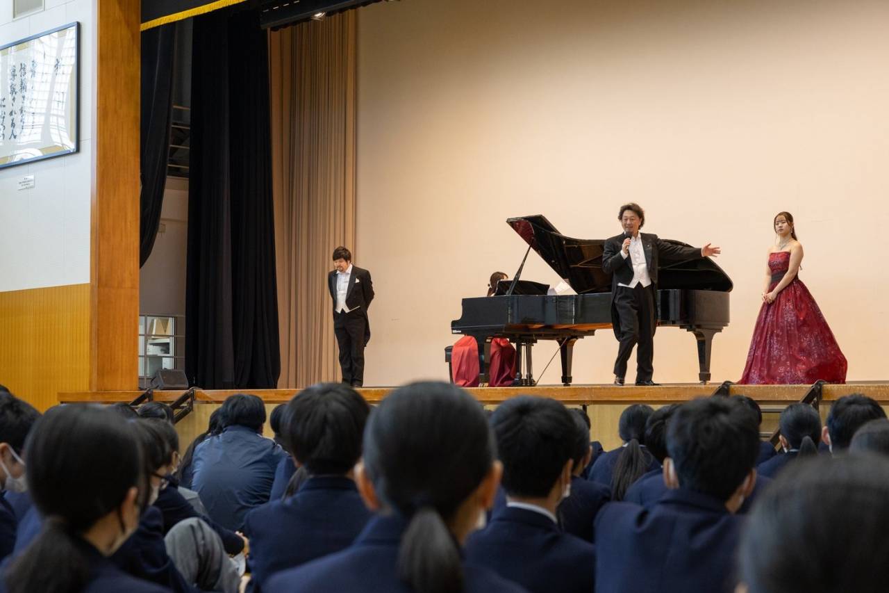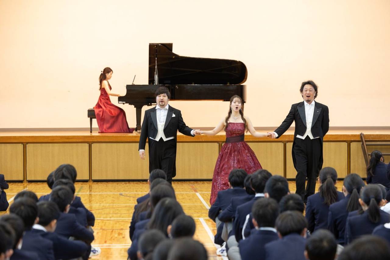 体育館にはYAMAHAのグランドピアノC7が設置されており、音楽公演として理想的な環境でした。訪問メンバーは、安田旺司(バリトン)/中東駿(テノール)/占部久美子(ピアノ)。学校側のご協力のもと、「鑑賞会を授業に接続する」設計で運用しました。