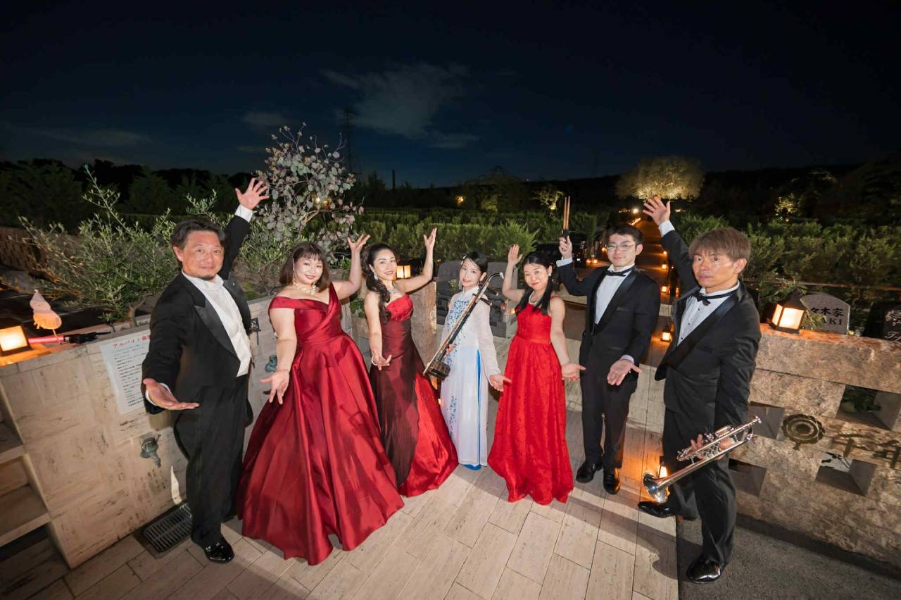 声楽×二胡×トランペット×ピアノ×パーカッションという編成は、野外演奏でとても相性が良いのです。バリトンの低音は地面の温度を伝え、ソプラノは灯りの粒をひとつずつ拾うようにきらめきます。二胡は中域で人肌の温度を描き、トランペットは夜空の抜けを作る。ピアノとパーカッションが呼吸のリズムを整えると、霊園ならではの静謐さと、大阪の開放感が同時に立ち上がってきます。