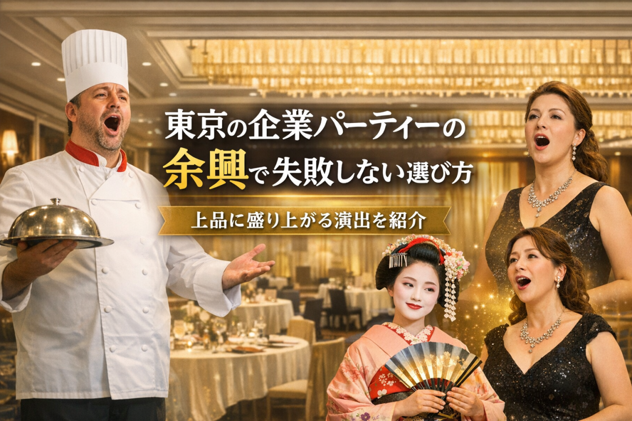 東京の企業パーティーでは、余興に求められる基準がとても明確です。ただ盛り上がればよいのではなく、会場の格に合うこと、参加者の年齢や立場を問わず受け入れられること、歓談や進行を壊さないことが大切になります。とくにホテル宴会場で行われる周年記念、表彰式、祝賀会、賀詞交歓会では、派手すぎる演出や内輪向けの出し物が、かえって全体の印象を下げてしまうこともあります。この記事では、東京の企業パーティーで余興選びに失敗しないための考え方を整理しながら、生演奏、シェフDeオペラ、舞妓withオペラの活かし方まで具体的にご紹介します。