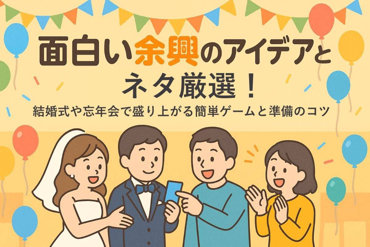 披露宴や忘年会、パーティーなど、どんなイベントでも盛り上がる「面白い余興」をお探しの方へ。注目される余興ネタを厳選し、人気の理由やポイントをまとめました。シーン別や参加者の年齢層に合わせて選べるので、失敗しない余興選びに役立ちます。