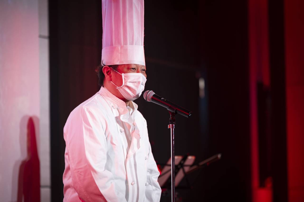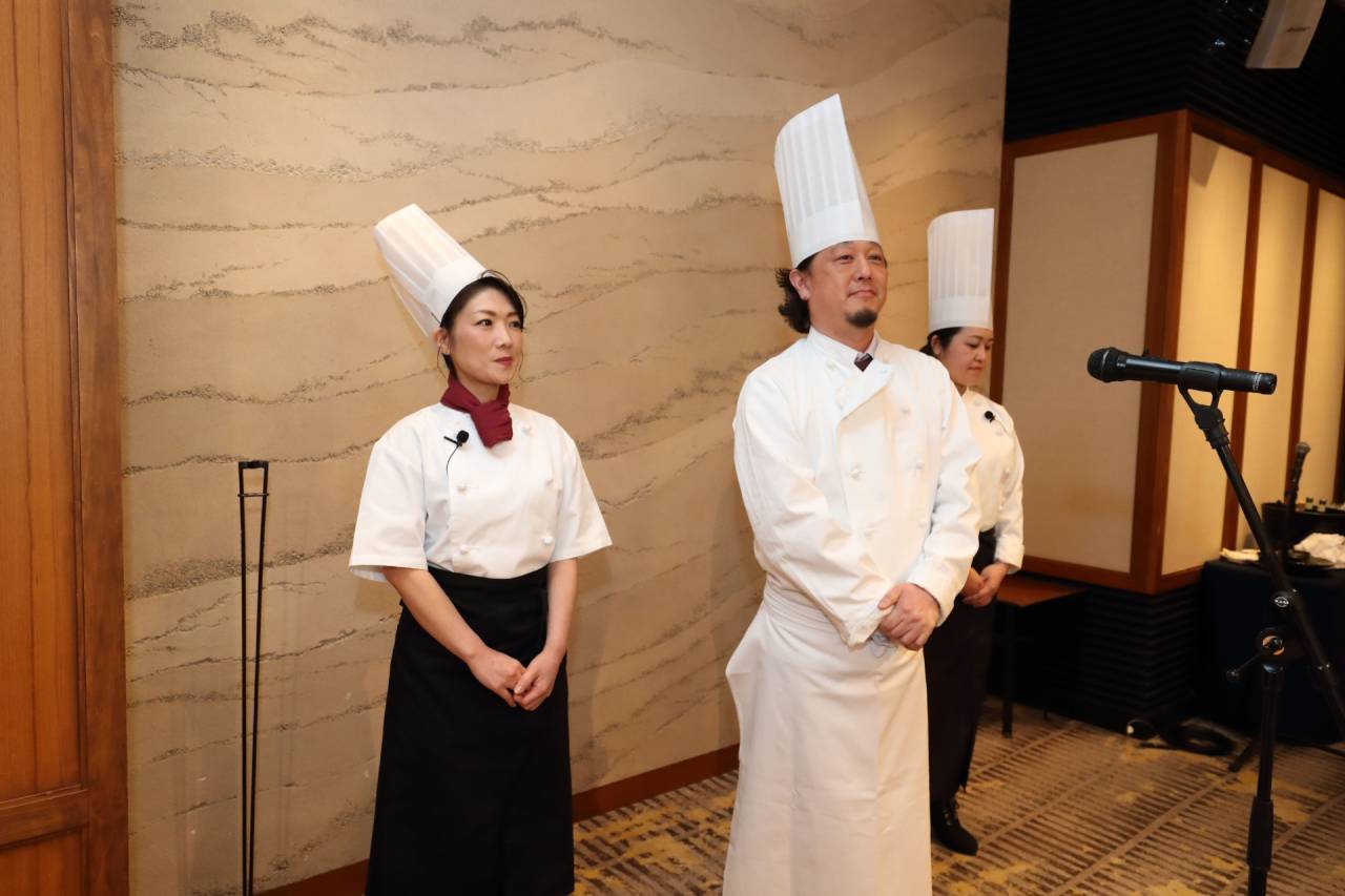 登場したシェフは、新郎新婦様へのお祝いの言葉を述べ、ゲストの皆様に丁寧にご挨拶をし、当日のお料理について説明を始めます。今回のお料理は特に力を入れた特別なメニューであること。新郎新婦様に実は五回も試食していただき、やっと完成したこと。その試食の中で、お料理以外にもたくさんの会話が生まれたこと。そうした話が披露宴の雰囲気に合った言葉で語られることで、会場は自然に引き込まれていきます。