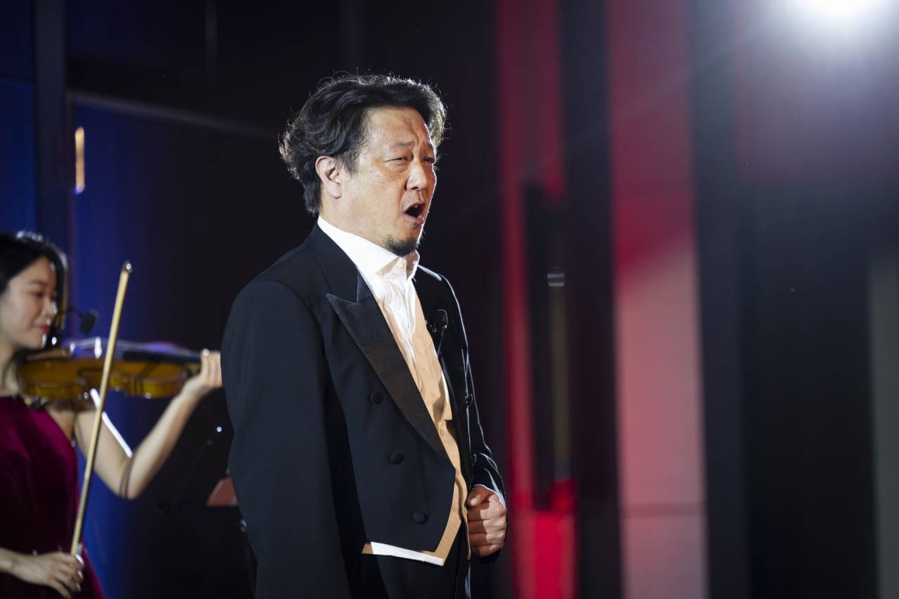 この演出のクライマックスは、やはり変身の瞬間です。シェフが「本日は特別に、昔の衣装に袖を通してまいりました」と告げ、コックコートを外し、エプロンを外し、コック帽を取る。すると中から現れるのは、燕尾服姿のオペラ歌手です。その瞬間に音源伴奏が流れ始め、先ほどまで料理を説明していたシェフが、本格的な歌で会場を包み込みます。